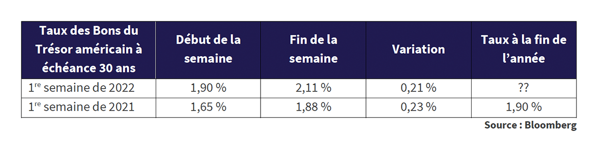 Ces changements de sentiment sur un marché en proie à la COVID ont provoqué des hausses hebdomadaires du taux des Bons du Trésor à long terme parmi les plus fortes récemment observées. Comme le montre le tableau ci-dessous, la première semaine de 2022 a été marquée par une hausse de 0,21 % du taux des Bons du Trésor à échéance 30 ans alors que les investisseurs s’intéressent aux signes précurseurs d’une hausse de l’inflation et laissent de côté leurs craintes d’Omicron. Les responsables de la Réserve ont fait savoir que l’incroyable assouplissement de la politique monétaire n’était, selon eux, plus nécessaire, compte tenu des signes d’une économie solide et en plein reprise, ce qui n’a en rien aidé les choses.