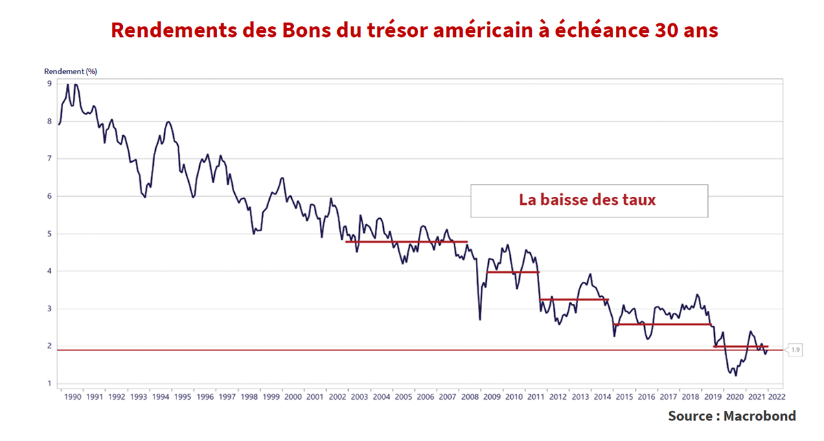 Le graphique ci-dessous montre le taux des Bons du Trésor américain à long terme depuis 1990, date à laquelle le régime de « ciblage de l’inflation » des banques centrales monétaristes est devenu populaire. Les taux à long terme ont baissé de façon constante entre 1990 et 2000. Depuis lors, les taux ont baissé à chaque épisode où les superhéros des banques centrales ont lutté contre l’Armageddon financier. Le taux des Bons du Trésor à long terme s’est maintenu à 4,5 % dans les années 2000. Il est ensuite tombé à 4 % après la crise du crédit de 2008, avant de redescendre à 3,5 % avec la mise en place de l’assouplissement quantitatif par les banques centrales en réponse à la crise de la dette européenne. Il n’y a même pas eu de crise financière en 2019 lorsque la Réserve de Powell a capitulé devant les attaques sur Twitter de Donald Trump et a ramené les taux à long terme à 3 % sans raison apparente, si ce n’est l’approche de l’élection présidentielle de 2020. La crise engendrée par la pandémie de COVID a fait passer les taux des Bons du Trésor à long terme sous la barre des 1 % au moment où la panique a débuté. La clôture du 9 mars à 0,997 %, lorsque les marchés ont paniqué à cause de la COVID, a probablement établi le record du taux le plus bas, mais qui sait ce qui se passera lors de la prochaine crise.