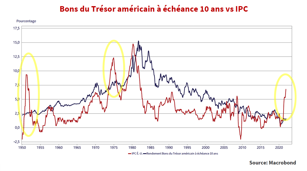 En l’absence de gain en capital, les rendements actuels offerts sur les marchés obligataires ne sont pas attractifs, en raison du risque d’une hausse de l’inflation qui pèse sur le marché obligataire. Selon les monétaristes, la condition préalable à une hausse de l’inflation est un excès de monnaie, et nous en avons à revendre. La hausse de l’inflation est déjà là, avec un IPC américain en hausse de 7,0 % sur un an en décembre. Comme nous l’avons dit précédemment, le parallèle historique avec le début du choc pétrolier de 1973 nous pousse à nous demander si nous n’allons pas attendre en vain que l’inflation se modère comme l’ont fait nos parents dans les années 1970.