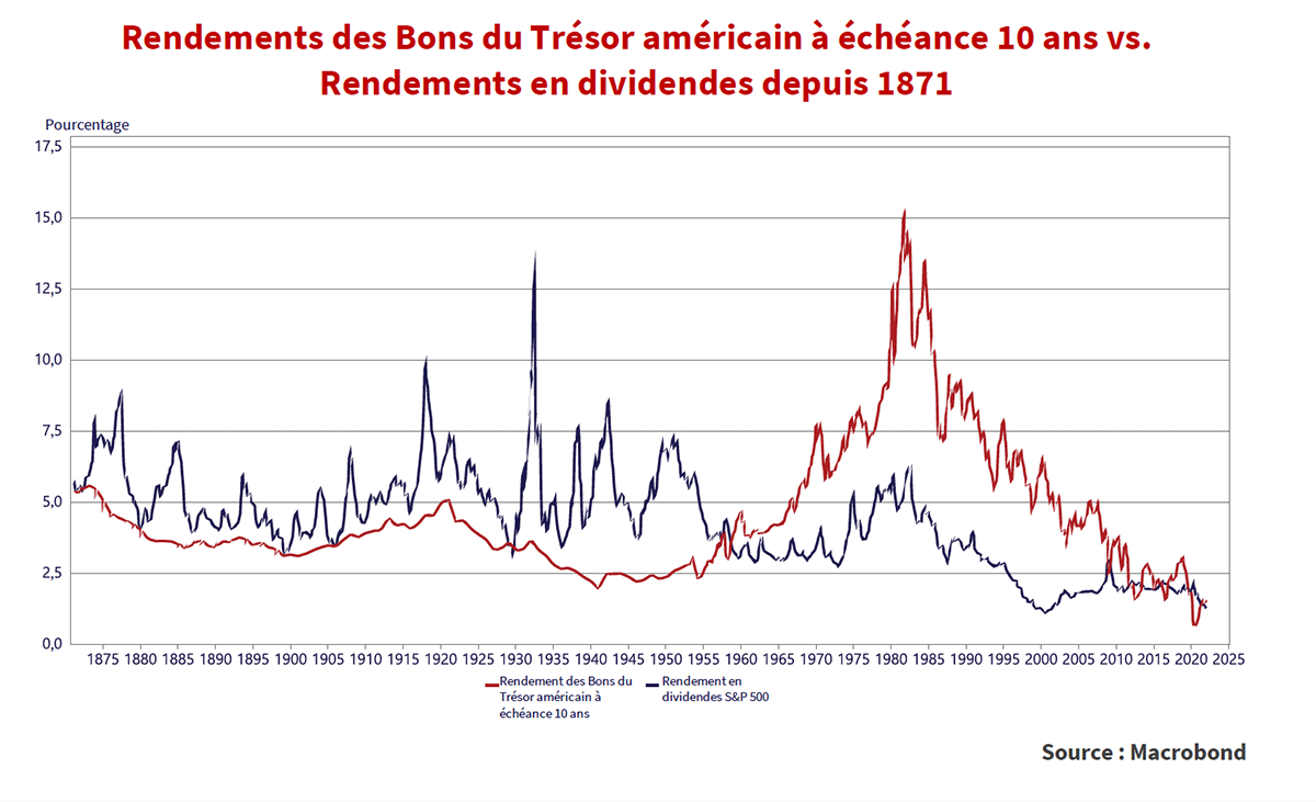 Comme le montre le graphique ci-dessus, de 1871 à 1959, le rendement en dividendes des actions de l’indice S&P était supérieur à celui des Bons du Trésor à échéance 10 ans. Cela reflétait la perception des investisseurs selon laquelle les revenus des actions étaient plus risqués que ceux des obligations, en particulier pendant la période qui a suivi la Grande Dépression des années 1930. Depuis 1959, les rendements en dividendes sont généralement inférieurs aux rendements des obligations. En effet, les investisseurs sont friands des flux de trésorerie croissants des actions par rapport aux flux de trésorerie fixes des obligations. Les faibles rendements obligataires « d’urgence » pendant les programmes d’assouplissement quantitatif qui se sont succédé depuis la crise de la dette européenne ont donné aux rendements en dividendes un avantage sur les obligations en 2012 et 2016. Ce fut à nouveau le cas lors de la pandémie de COVID en 2020, lorsque les rendements obligataires ont chuté et que les rendements en dividendes ont augmenté.