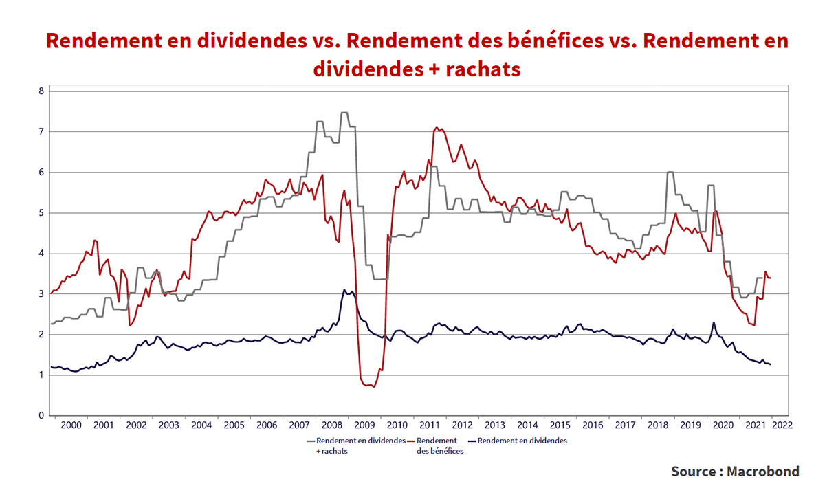 La ligne rouge représente le rendement des bénéfices du S&P, soit les bénéfices nets de tous les émetteurs de l’indice divisés par le prix cumulé de leurs actions. C’est ce que gagne le marché en termes de rendement. La ligne bleue illustre le rendement en dividendes, c’est-à-dire le versement total de dividendes divisés par les cours cumulés des actions. La ligne grise ajoute les effets des rachats d’actions par les émetteurs de l’indice.