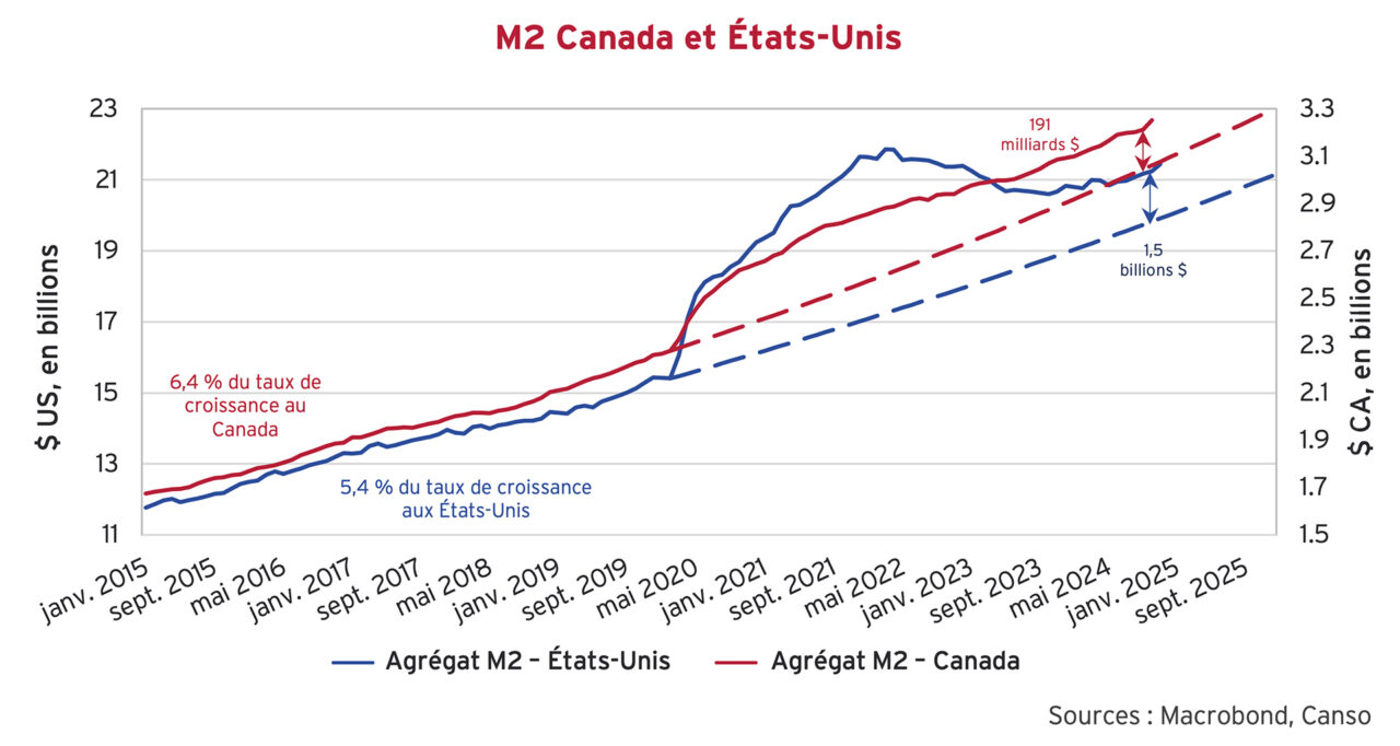 Ce graphique permet d’expliquer clairement la mise en œuvre de la politique monétaire. La Banque du Canada a donné des tours de vis plus musclés à son taux directeur, mais a cessé ses augmentations et procédé à des réductions plus tôt que la Fed. C’est ce qui ressort de l’agrégat canadien M2; celui-ci a atteint un sommet et a maintenant presque retrouvé son taux de croissance avant la pandémie, à mesure que la Banque du Canada a poursuivi l’expansion de la masse monétaire. Aux États-Unis, la Fed n’a pas assoupli ses taux de manière aussi dynamique et a même réduit l’agrégat M2 de 21,9 à 20,9 billions de dollars pour maintenir les taux d’intérêt à un niveau élevé. Le graphique montre la différence majeure entre les taux de croissance. L’agrégat M2 canadien a continué de croître afin de maintenir puis réduire les taux d’intérêt. L’agrégat M2 américain s’est en fait contracté avant de reprendre un modèle de croissance plus normal. Il a augmenté de 600 milliards de dollars et a maintenant retrouvé un taux de croissance similaire à celui avant la pandémie. Ce faisant, la Fed a pu abaisser les taux d’intérêt. Comme le montre le graphique, l’agrégat M2 canadien dépasse d’environ 191 milliards de dollars le taux de croissance qu’il aurait atteint avant la pandémie, et l’agrégat M2 américain dépasse le sien d’environ 1,5 billion de dollars.