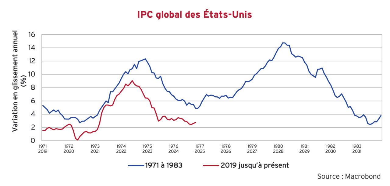 Le graphique ci-dessus illustre l’IPC américain en dressant la comparaison entre les années de 1971 à 1983 (ligne bleue) et la période actuelle depuis 2019 (ligne rouge). Dans les années 1970, l’IPC américain est passé de 3,6 % au début de 1973 à plus de 12 % en 1974. À l’époque, l’assouplissement monétaire visant à lutter contre l’embargo arabe sur le pétrole avait alimenté la hausse de l’inflation. Les prédécesseurs monétaires de la Fed pensaient avoir maîtrisé l’inflation qui était passée d’un peu moins de 12 % en 1975 à 5 % d’ici la fin de l’année 1976. Le passé n’est pas nécessairement garant de l’avenir. Toujours est-il que l’assouplissement qui s’en est suivi a rapidement fait grimper l’inflation à plus de 14 % avant que la Réserve fédérale, dirigée par Paul Volcker ne la maîtrise en relevant les taux d’intérêt à plus de 19 %. Les choses aujourd’hui ne sont pas si différentes. L’IPC américain est passé de plus de 8 % à moins de 3 %… Quel étrange sentiment de déjà vu! À l’heure actuelle, le marché obligataire baigne dans un optimisme similaire faisant croire que l’on reviendra bientôt à un IPC de 2 %. Or, qui dit vraiment que ce sera le cas?