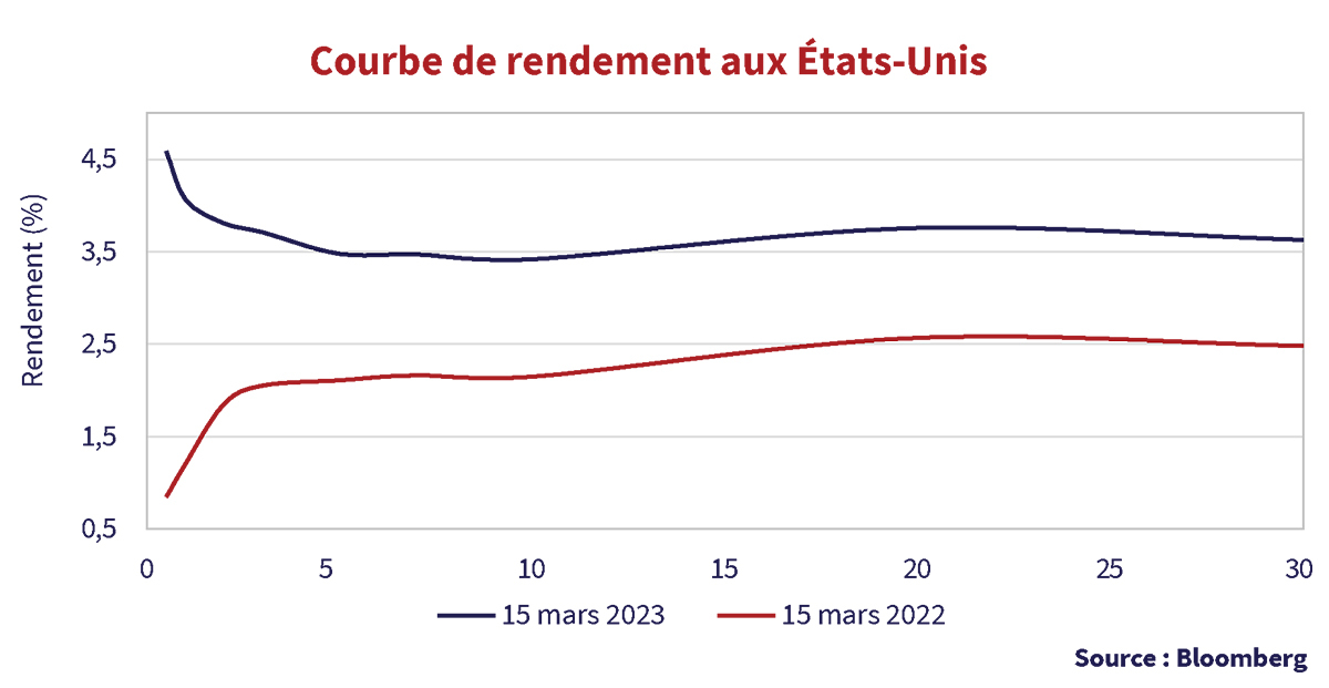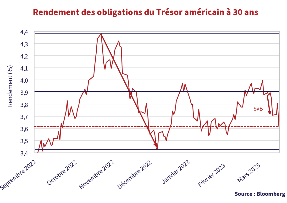À l’heure actuelle, le rendement de 3,6 % des bons du Trésor américain à 30 ans n’est pas très loin de la médiane de 3,9 % de la fourchette des récents rendements élevés et faibles de 4,4 % et 3,4 %, respectivement. Compte tenu de l’illiquidité du marché, il ne faut pas grand-chose pour que les rendements fluctuent considérablement d’une part et d’autres. L’énorme mouvement de 0,17 % du vendredi 10 mars, sur un rapport sur l’emploi apparemment légèrement positif (plus faible), s’est avéré être une réponse à la faillite de SVB qui a été reprise par la Federal Deposit Insurance Corporation (FDIC) des États-Unis. Bien qu’il s’agisse de la plus grande faillite bancaire depuis la crise du crédit de 2008 et que Crédit Suisse suscite également des inquiétudes, nous allons de l’allégresse à l’idée d’une baisse de l’inflation au désespoir qu’elle ne cède pas.
