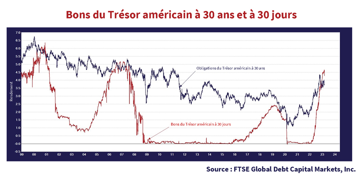 Un rendement de 4,0 % sur un bon du Trésor américain à 30 jours, longtemps considéré comme un investissement sans risque par les théoriciens des marchés financiers efficients, est plutôt bien comparativement à son rendement quasi inexistant au cours de la longue période de politiques de taux nul de 2011 à 2018. On pourrait croire que les investisseurs, surtout les professionnels, se précipiteraient pour obtenir cet alléchant rendement de 4,0 %. Comme on le dit chez Canso, « Quand l’argent liquide n’at aucune ’importance, préparez-vous à une débâcle! » C’est ce que nous disons habituellement lorsque les gens se bousculent pour acheter des actions, sans se soucier du risque de baisse, dans leur empressement à investir et à n’être laissés pour compte par les marchés en forte hausse. Cette fois-ci, c’est l’argent liquide qui pourrait être négligé par les investisseurs qui se hâtent à investir et à assurer leur coupon pour profiter de richesses futures dégagées par les éventuelles chutes des rendements et hausses des prix des obligations.