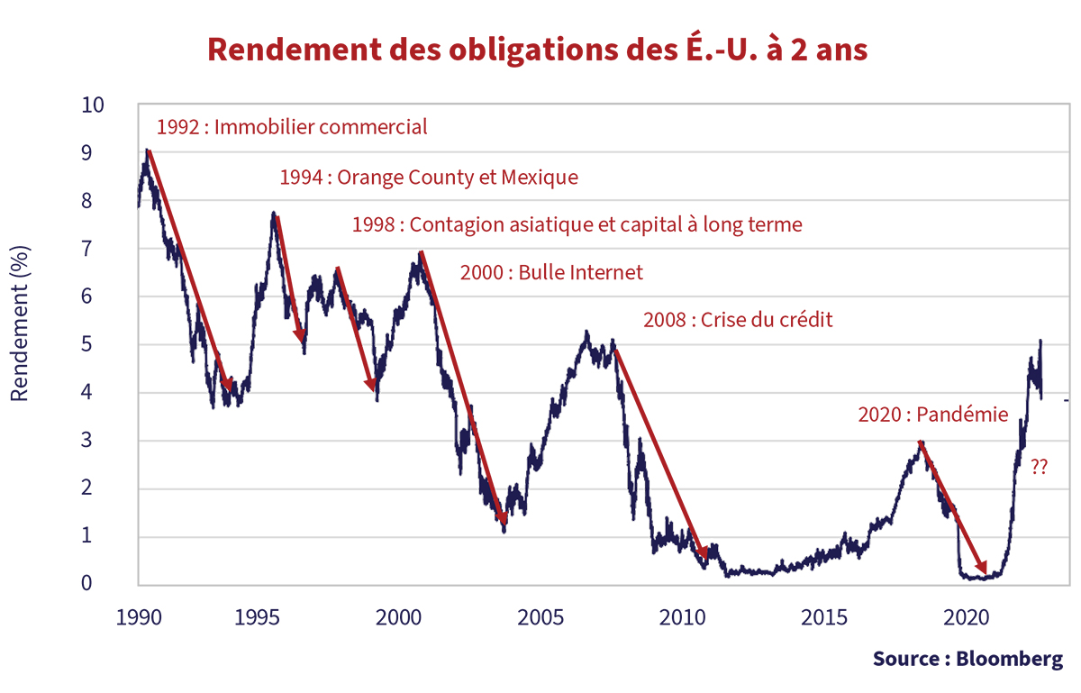 Si l’on en croit l’enthousiasme des marchés obligataires et boursiers, les récents problèmes financiers de SVB et de Crédit Suisse pourraient finalement inciter la Réserve fédérale à céder. L’une des caractéristiques durables de l’héritage d’Alan Greenspan à titre de président de la Réserve fédérale est que les investisseurs croient toujours que la Réserve fédérale « sauvera » les marchés financiers en cas de problème financier assez grave, l’« option de vente de la Réserve fédérale » tant vantée. Comme beaucoup le soulignent, la baisse de 1,1 % du rendement de l’obligation du Trésor américain à 2 ans au cours des 3 jours qui ont suivi la révélation des problèmes de la SVB bat tous les records. Au moment de la publication, le 15 mars, les problèmes de Crédit Suisse et les inquiétudes généralisées concernant le système bancaire ont entraîné une nouvelle baisse massive de 0,4 % de l’obligation du Trésor américain à 2 ans.