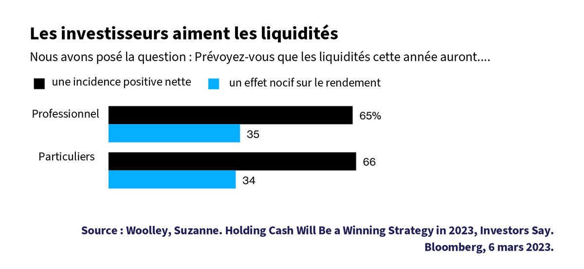 « En 2023, l’argent est loin de n’avoir aucune espèce d’importance. C’est le verdict des 404 investisseurs professionnels et particuliers qui ont participé au dernier sondage MLIV Pulse. Les deux tiers des répondants ont indiqué que les espèces dans leur portefeuille favoriseraient leur rendement plutôt que d’y nuire au cours de la prochaine année. Ces liquidités en disent long sur l’instabilité de l’environnement financier et économique. Les craintes d’un marché baissier potentiel, de hausses de taux continues de la Réserve fédérale et d’une récession imminente ont effarouché les investisseurs anxieux, craignant que l’année 2023 ne soit une reprise de l’année 2022, année où les portefeuilles ont été durement mis à l’épreuve. »