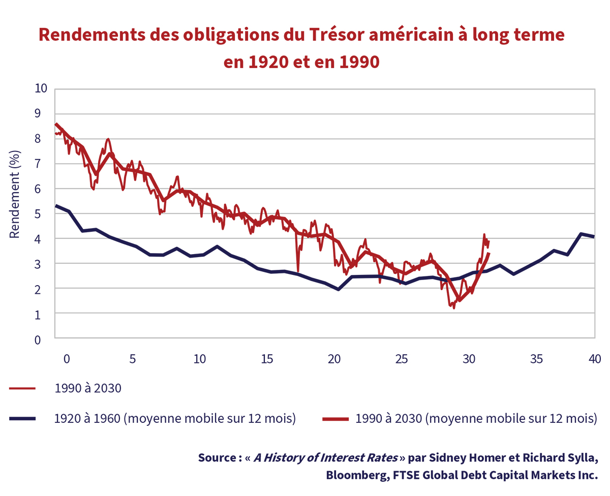 Pour donner une perspective historique, nous pensions mettre la touche finale à nos réflexions sur les placements avec une mise à jour de notre tableau historique des rendements à long terme. Nous avons créé ce graphique, à un moment qui nous paraît déjà bien lointain, pour avoir une idée de la façon dont nous nous comparons au passé en matière de placements. Il compare notre cycle actuel depuis 1990 à celui des 40 années entre 1920 et 1960. Nous avons choisi ces années en raison des similitudes entre le passage de la production militaire de la guerre froide à des utilisations civiles, avec la chute de l’Union soviétique en 1989, et le passage de la production militaire de la première guerre mondiale à celle de biens de consommation civils en 1919. La ligne bleue est la moyenne mobile du rendement des obligations à long terme de 1920 à 1960. La ligne rouge mince correspond au rendement des obligations à long terme depuis 1990 et la ligne rouge plus épaisse correspond à sa moyenne mobile.
