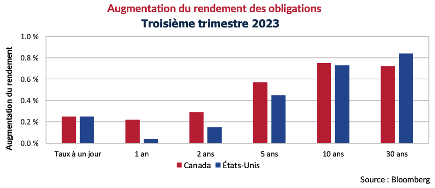 La hausse rapide des taux d’intérêt cet été fut cruelle pour le marché des obligations. Les rendements des courbes des obligations des gouvernements canadien et américain ont bondi, atteignant des niveaux inédits depuis 2007. Les hausses les plus marquées ont été enregistrées à long terme, les rendements à 30 ans ayant augmenté de 72 points de base au Canada et de 84 points de base aux États-Unis, entraînant une baisse de plus de 10 % des prix des obligations à long terme. La volatilité des taux reste une épine dans le pied des investisseurs obligataires, de nombreux gestionnaires de portefeuilles à revenu fixe naviguant tant bien que mal les eaux de marchés dangereux et inconnus. La hausse marquée du troisième trimestre menace les marchés obligataires, qui enregistrent des baisses annuelles pour une troisième année consécutive.