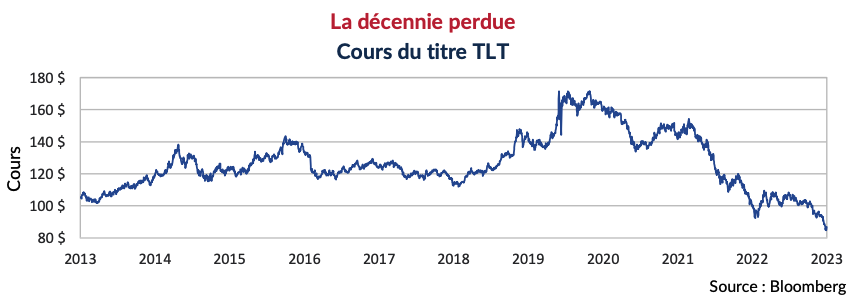 Après avoir reculé de 50 %, le titre TLT se négocie bien en deçà de son cours d’il y a une décennie. En tenant compte des distributions, le site Web iShares.com indique que 10 000 $ investis le 17 octobre 2013 n’auraient atteint que 10 127 $ après 10 ans.
