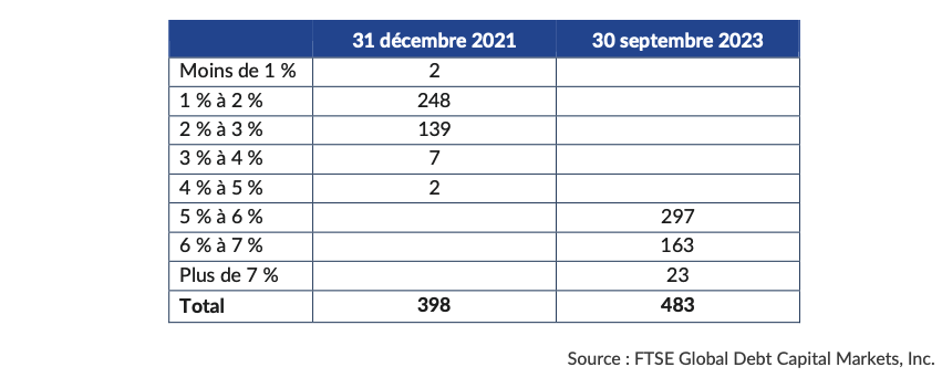 Pour illustrer les répercussions des hausses de taux au cours des deux dernières années, regardons l’indice FTSE Short Corporate. À la fin de 2021, l’indice FTSE Short Corporate comptait 398 obligations. De ce nombre, la vaste majorité des titres échangés offraient un rendement global de 1 % à 3 %. Seules 9 obligations affichaient des rendements supérieurs à 3 % et seulement 2 d’entre elles des rendements supérieurs à 4 %.