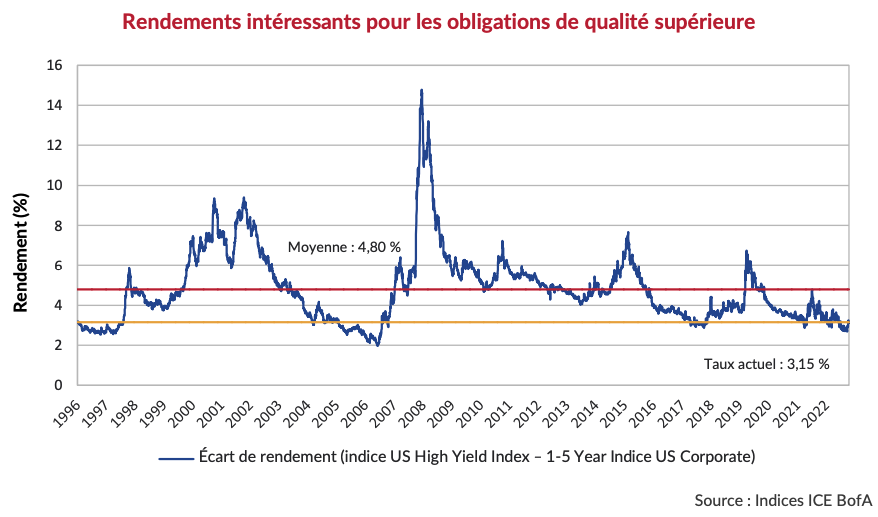 Les rendements des obligations de qualité supérieure sont également de plus en plus attrayants par rapport au marché plus spéculatif des obligations à rendement élevé. Avec un peu plus de 9 %, le rendement global de l’indice ICE BoA U.S. High Yield a attiré l’attention des investisseurs en mal de rendement. En termes absolus, cela peut sembler attrayant compte tenu des faibles rendements historiques, mais par rapport au rendement des obligations de sociétés de qualité supérieure à court terme, ce rendement laisse beaucoup à désirer. Le tableau ci-dessous illustre la différence de rendement entre les indices américains à rendement élevé et ceux de qualité supérieure à court terme. Avec un écart de 3,2 %, nous préférons protéger nos portefeuilles avec des obligations de qualité supérieure.