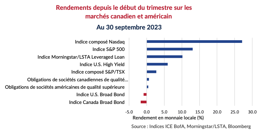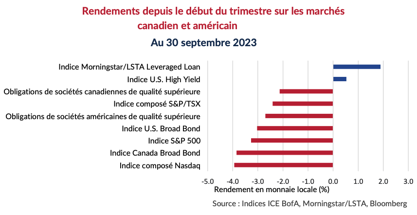 Malgré la hausse des taux, les marchés obligataires n’ont pas tous été négatifs au cours du trimestre. Les écarts de taux sur les prêts à rendement élevé et les prêts à effet de levier surclassent ceux de l’indice depuis le début de l’année. Ces marchés ont évité les défauts de paiement et ont esquivé les craintes d’un atterrissage « pas trop en douceur ». Leur courte durée et, dans le cas des prêts à effet de levier, l’augmentation des paiements des coupons ont fait grimper ces indices. Les marchés boursiers ont perdu une partie des gains du premier semestre, mais, dans l’ensemble, ils demeurent très performants sur les trois premiers trimestres de l’année.
