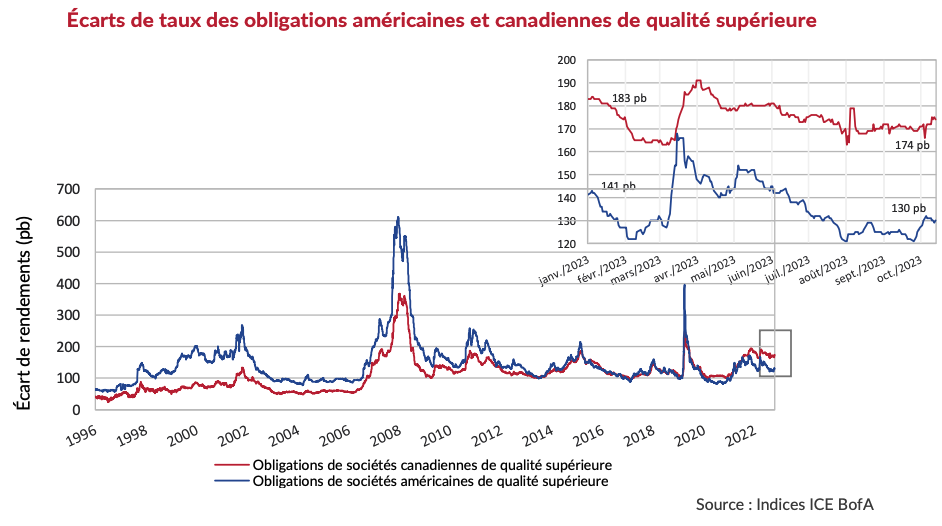 Contrairement à la volatilité des taux d’intérêt gouvernementaux, les écarts de taux des obligations de sociétés sont demeurés relativement stables. Les écarts des titres canadiens de qualité supérieure se chiffraient à 171 points de base à la fin du trimestre et ceux des titres américains, à 127 points de base, ce qui représente un resserrement de 4 et de 7 points de base, respectivement, au cours de la période. Aux États-Unis, les écarts se sont resserrés cette année en juillet et en septembre et demeurent nettement inférieurs à la moyenne historique de 147 points de base. Au Canada, les resserrements de février ne se sont pas reproduits, et les écarts ont désormais une valeur raisonnable.