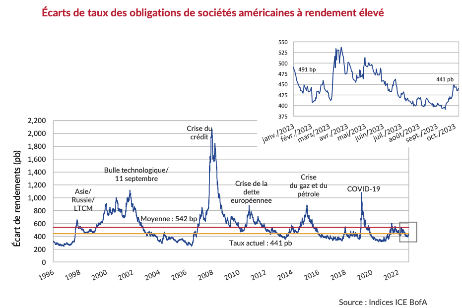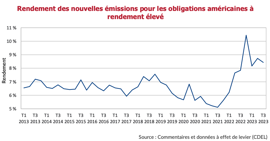 Le marché américain des titres à rendement élevé comptait des émissions se chiffrant à plus de 40 milliards de dollars américains au cours de chacun des trimestres de l’année, ce qui est supérieur aux niveaux historiquement bas de 2022, mais plutôt faible par rapport à la taille du marché, qui se chiffre à 1,2 billion de dollars américains. La hausse des coûts de financement continue de décourager de nombreux émetteurs de titres à rendement élevé. Le graphique ci-dessous illustre la forte hausse des rendements des nouvelles émissions, qui ont repris du poil de la bête au cours du dernier trimestre, pour clore la période à 8,8 %.