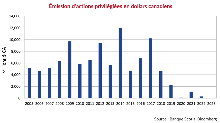 Les banques ont passé la majeure partie des dix dernières années à racheter leurs anciennes actions privilégiées et à les remplacer par des actions privilégiées de fonds propres d’urgence en cas de non-viabilité (FPUNV) (qui peuvent être converties en actions ordinaires au gré des organismes de réglementation). Le lancement de billets de capital à recours limité (« BCRL ») en 2020 a encore plus dissuadé les banques d’émettre des actions privilégiées de détail. Les BCRL sont de rang égal aux actions privilégiées, mais leurs paiements d’intérêts sont déductibles d’impôt, ce qui rend leur émission attrayante pour les banques. Le BSIF a limité le montant des BCRL que peuvent émettre les banques, mais une dérogation est possible si les banques disposent d’autres fonds propres de même rang « émis pour les institutions ». Par conséquent, les banques canadiennes ont cessé d’émettre de nouvelles actions privilégiées à l’intention des investisseurs particuliers et se sont tournées vers les investisseurs institutionnels.