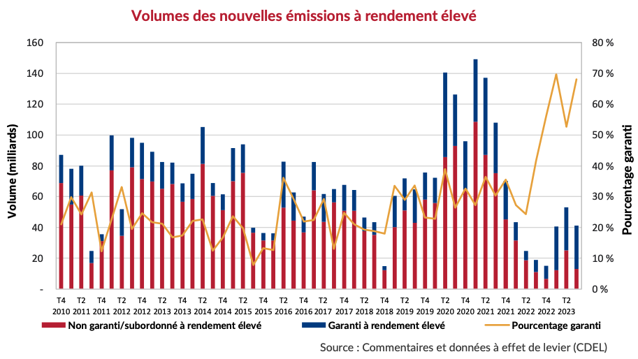 De plus en plus d’émetteurs à rendement élevé se tournent vers des opérations garanties pour atténuer l’incidence de coupons plus élevés. Pour certains émetteurs de titres de qualité inférieure, il s’agit d’une nécessité. Le graphique ci-dessous illustre les volumes de nouvelles émissions par trimestre, ventilés en placements garantis et non garantis. Il trace également les volumes garantis en pourcentage des émissions totales afin de souligner la forte progression, laquelle a atteint des niveaux sans précédent. Les émissions garanties n’ont jamais compté pour plus de 50 % des titres à rendement élevé sur un marché au cours d’une même année.