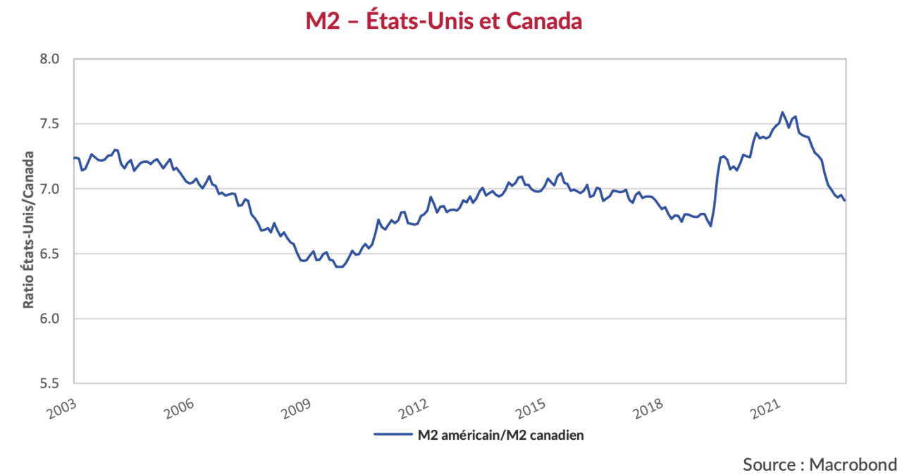 La taille de la prime ou du désavantage au niveau des rendements des obligations à long terme du Canada par rapport aux États-Unis est-elle justifiée? Nous avons fait quelques analyses et réfléchi à la question. Si les États-Unis augmentaient leur masse monétaire à un rythme plus rapide que celui du Canada, le dollar canadien serait plus rare comparativement au dollar américain, et cela pourrait se répercuter sur les obligations. Le graphique ci-dessous montre que ce n’est pas le cas. Le ratio de la M2 des États-Unis et de celle du Canada était de 7,2 en 2003 et de 6,9 aujourd’hui. Ce ratio est tombé à 6,4 après la crise du crédit de 2008, avant de remonter à 7, de bondir à 7,6 pendant la crise sanitaire, puis de fondre à 6,9, le Canada ayant créé plus de M2 que les États-Unis.