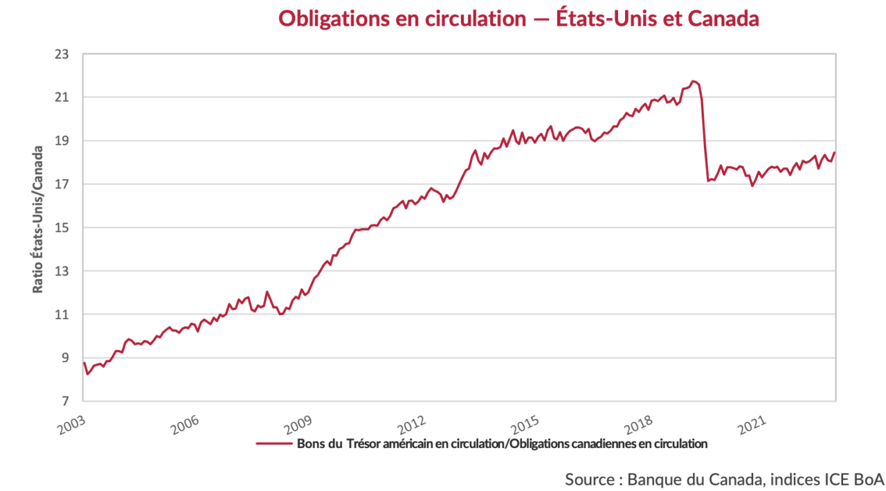 Le graphique suivant compare le ratio des bons du Trésor américain en circulation par rapport aux obligations du gouvernement du Canada en circulation. L’idée est que si l’inventaire du Trésor américain augmente par rapport à celui du Canada, le cours relatif des bons du Trésor américain devrait chuter. Il semblerait que nous sommes sur la bonne voie. En 2003, l’inventaire des bons du Trésor américain était 9 fois plus élevé que celui des obligations du Canada. Ce ratio a augmenté à 15 après la crise du crédit de 2008 et l’assouplissement quantitatif ayant suivi la crise de la dette européenne en 2011. Il a culminé à 22 avant la pandémie, puis s’est replié à 18, car le Canada a émis relativement plus d’obligations récemment. Cela fait valoir que les obligations à long terme du Canada se sont raréfiées comparativement aux bons à long terme du Trésor et pourrait expliquer les raisons pour lesquelles le rendement des obligations à long terme du Canada est inférieur.