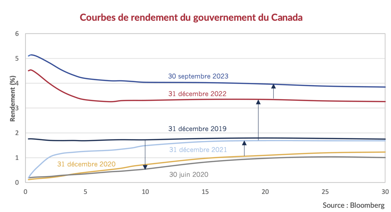 Ces banques centrales ne se sont pas seulement confondues avec leurs aventures en politique monétaire, elles ont rendu les investisseurs obligataires désespérément confus, comme en témoigne la courbe de rendement du gouvernement du Canada, ci-après. L’assouplissement de la politique monétaire à la fin de 2019 a donné lieu à une courbe de rendement plutôt plate. Les rendements ont ensuite chuté avec la stimulation monétaire de la pandémie et sont devenus une courbe de rendement « normale », à savoir une courbe dont les rendements à court terme sont inférieurs aux rendements à long terme. Cette courbe normale a perduré jusqu’en décembre 2021, même avec l’augmentation des rendements au cours de la période.