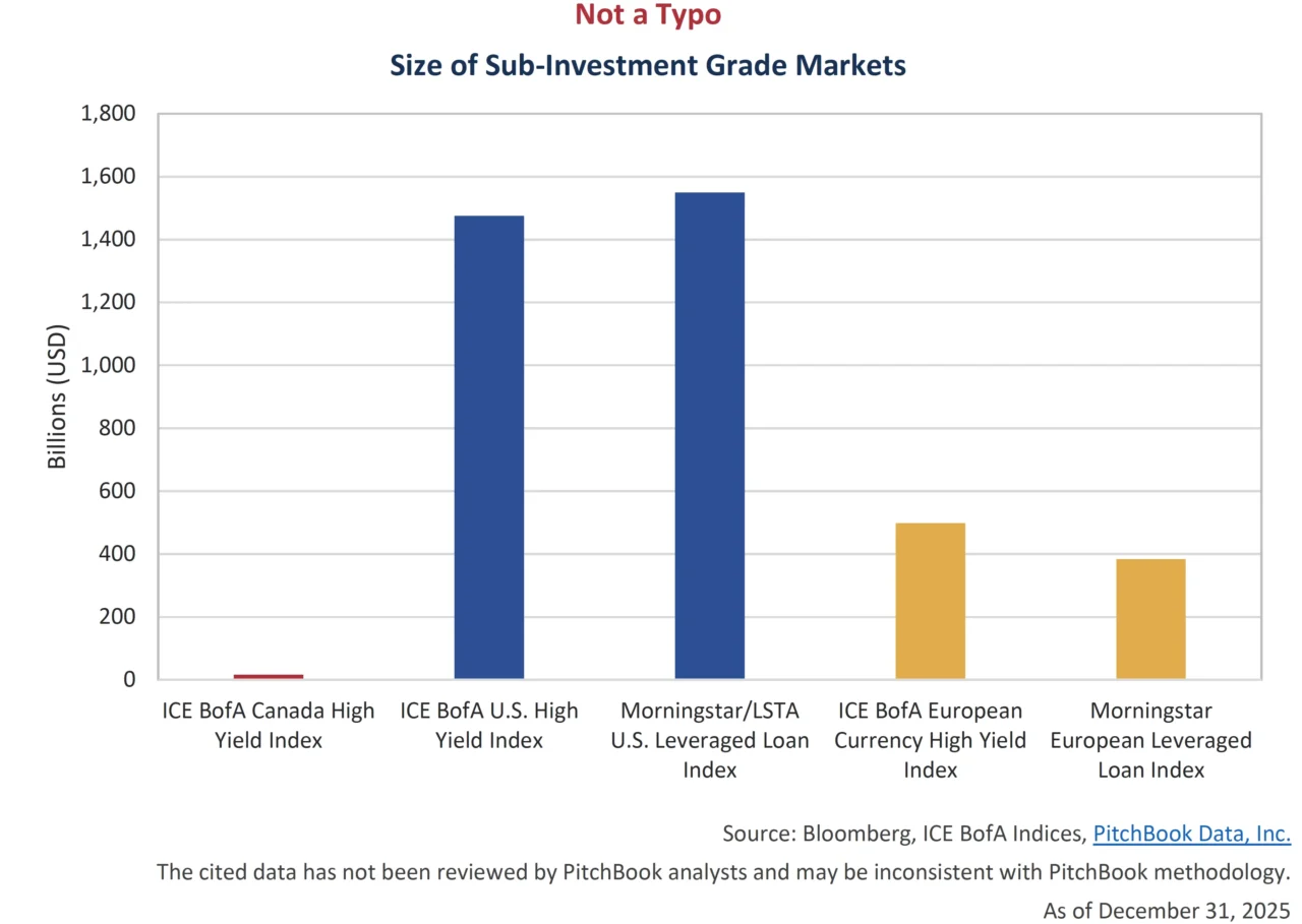 The Canadian high yield market experienced a revival of sorts as new issuance increased to $7.3 billion in 2025, the highest year since 2021’s $9 billion record. A record number of inaugural issuers also came to market, with 11 new names joining the fray. Despite the healthy year, it is still difficult to consider the Canadian high yield space a fully formed market. The Canadian high yield bond market sits at a meager C$23 billion, or US$17 billion equivalent, compared to its U.S. counterpart at US$1.5 trillion and European counterpart at US$499 billion. Furthermore, the U.S. and European levered loan markets, which also include corporate issuers rated BB & Below, contribute an additional US$1.55 trillion and US$383 billion, respectively. Canada does not have a levered loan index.
